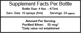 | Ingredients | Purified Silver, Deionized Water. Contains no artificial ingredients, preservatives or additives, 24 Sprays per bottle. |