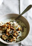 Steel-cut oatmeal recipe with pumpkin seed oil, birch syrup, and a crunchy topping of walnuts, seeds, and coconut!